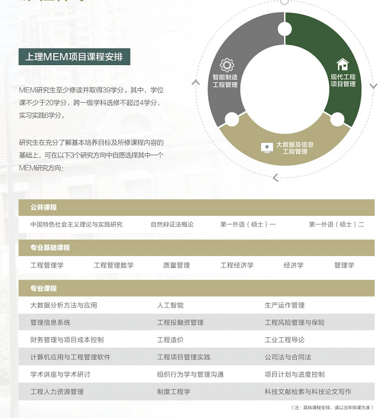 上海理工大学是全国第一批获批的工程管理镇士(MEM)上海理工大学的“专业学位”教育历史源远流长,1981年培养单位,是上海市工程管理学会理事长单位暨办事机构就与美国麻省理工学院斯隆管理学院合作,举办了由28名所在地,同时是《上海市专业学位(MEM)论文基本要求与学员参加的在职管理干部教育强化班,为期14个月的全英评价指标体系》的牵头制定单位。2018年11月成为“工程语授课和5个月的企业实习,完成了19个管理学科科研项管理硕士专业学位与IPMP认证合作培养单位”,并被授权目和高质量论文。成为国内最早与美国合作并进行国际交为:国际项目经理(IPMP)人才培养基地,在MEM教育流的院校。美国华尔街日报在1983年曾对此进行了专题报领域具有很强的实力。从2011年起开始面向社会招生。